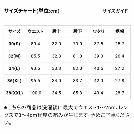 ※こちらの商品は洗濯後に最大でウエスト1〜2cm、レングスで3〜4cm程度の縮みが生じます。