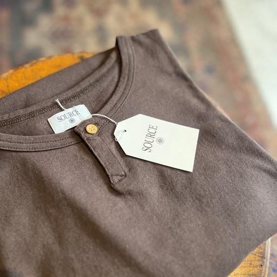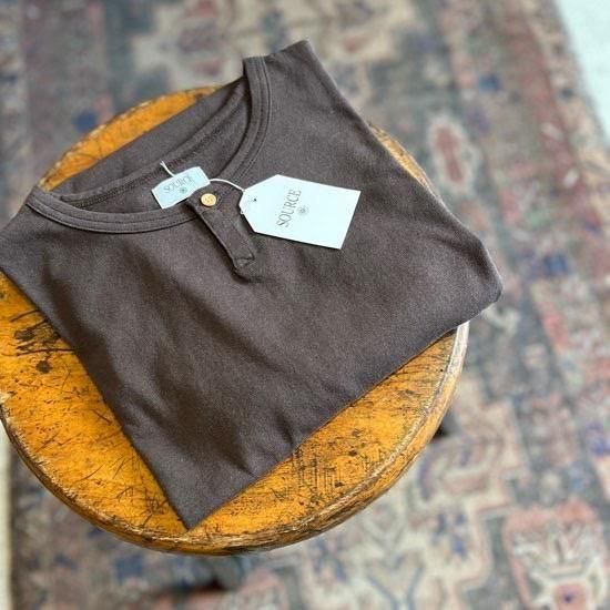 定番的でオールドなヘンリーTシャツのイメージをSOURCEでは壊したく、ネックが浅めの1つボタンという点にボタンのサイズも従来のものは13mm程度の物が多く見られますが、SOURCEの物は10mmの物を採用しました。