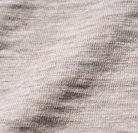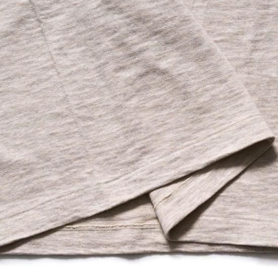 12番のムラ糸で独特の陰影が出るように編まれたこの生地はシャドウボーダーと呼ばれており、無地でありながらうっすらと横段のようなムラが浮かびます。