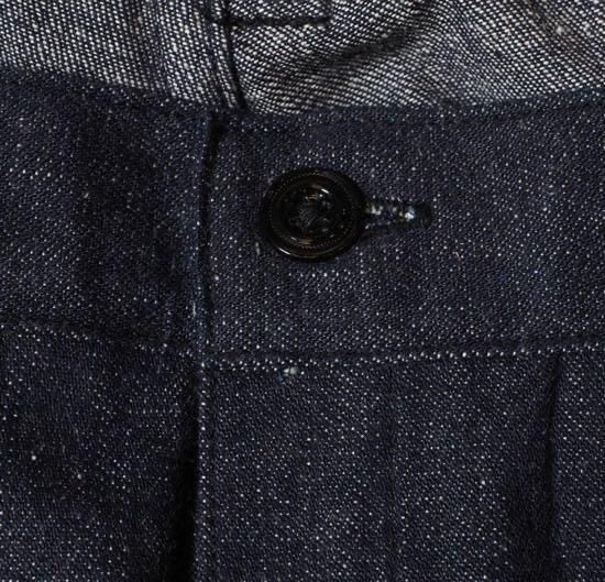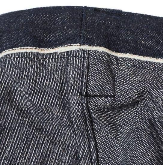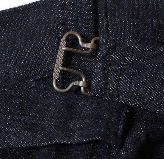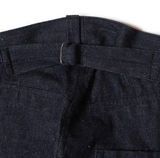 フロントの位置、やや下部にポケットがついたウエスト丈のオーバーオールです。ブラウスとほぼ同年代と思われるため、カウボーイのチャップスのようにポケットはウエスト部に巻くキドニーベルトに干渉しないよう、下部に設定したことも考えられます。1902年のシアーズのカタログには、このポケットスタイルのパンツは「パンタロン」とも呼ばれ多くラインナップされています。