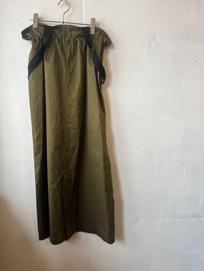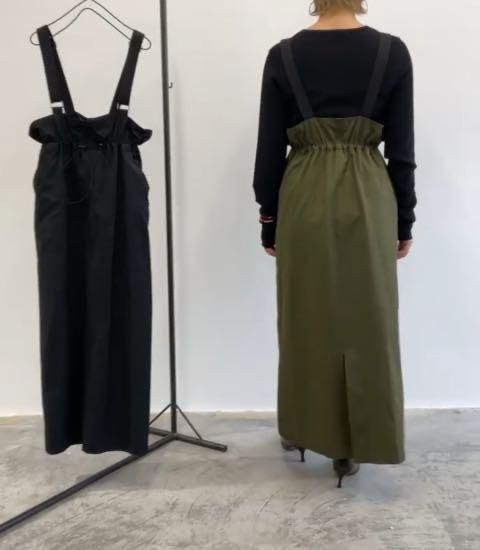 カジュアルさと女性らしさどちらも感じさせてくれるショルダーストラップ付きのロングスカート。