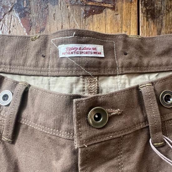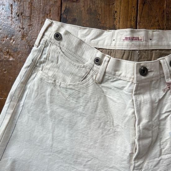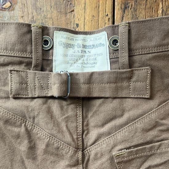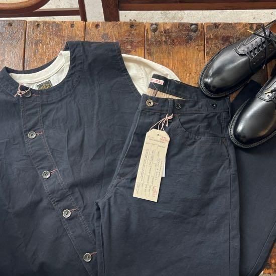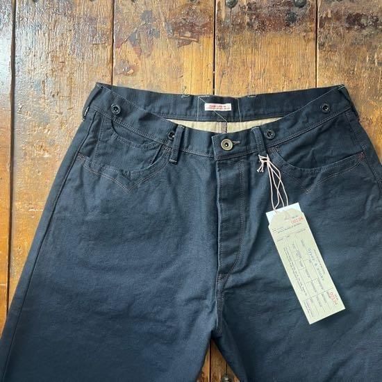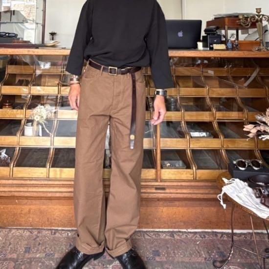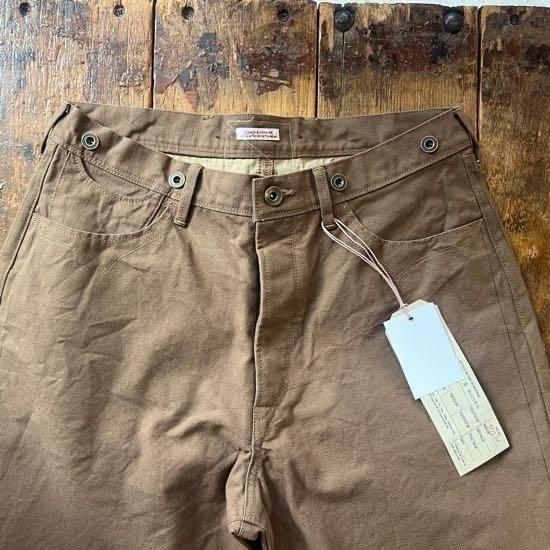 15ozアーミーダックを使い、30sのロガーパンツに落とし込みました。やや太めのストレートシルエットは武骨なロガーの証。脇ポケットの飾りステッチやベルトに乗ったコインポケットなど、通常の5ポケットパンツには無いヴィンテージのディティールが満載。脇の縫い合わせ部分には、生地幅1インチのBULE LINE が特徴的な1本。