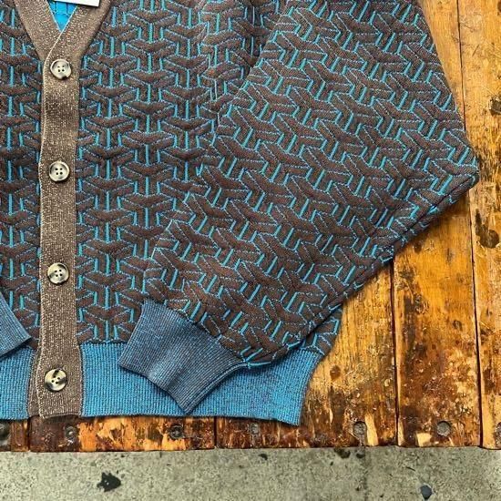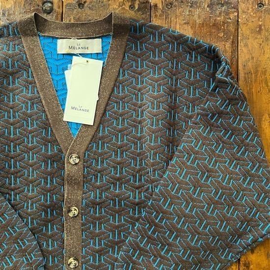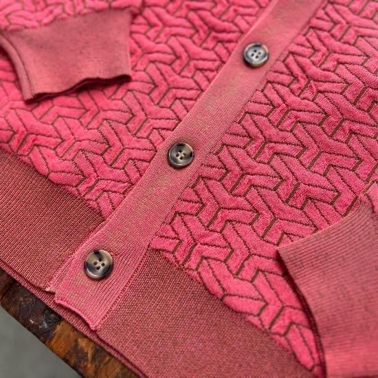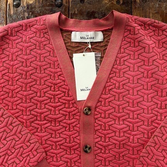 レーヨンxナイロン糸とポリエステル糸を使用し、12ゲージのふくれジャガードで編み上げた、立体感のあるニットカーディガン。