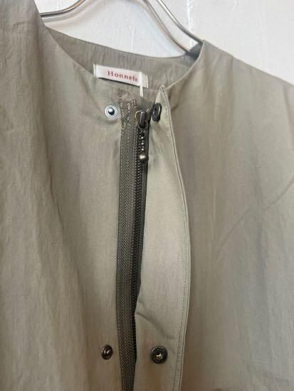 すっきりとしたノーカラーはブラウスやハイネックを合わせたり、