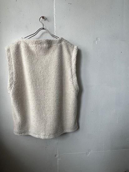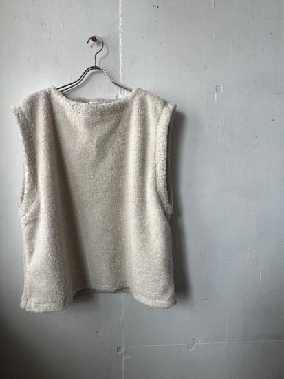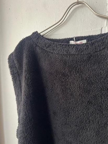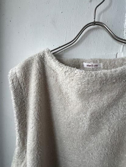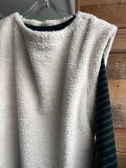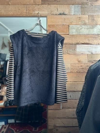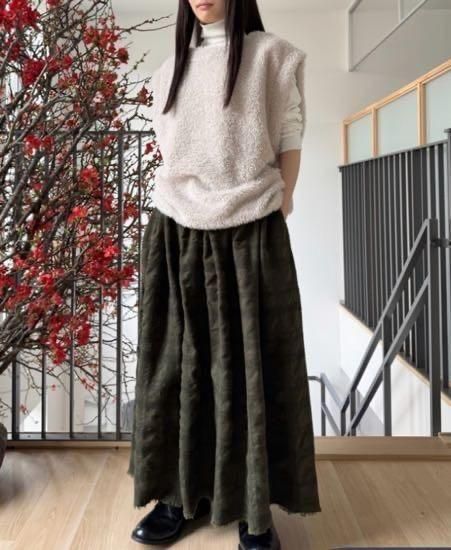 全体的にややゆとりのあるサイズ感で、ネックは少し広め、アームホールも大きめに作られており、重ね着しても窮屈さを感じにくいので、シャツやカットソー、ワンピースなど、様々なアイテムと合わせて着て頂けます。